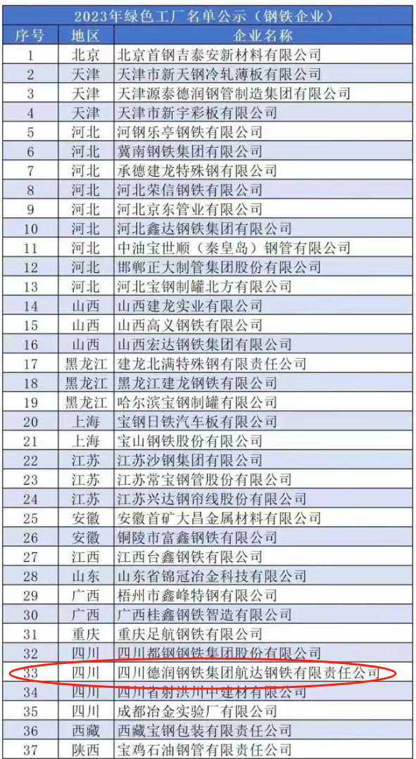 1月5日,国家工业和信息化部公布了《关于2023年度绿色制造名单及试点推行“企业绿码”有关事项的通知》,四川德润钢铁集团航达钢铁有限责任公司被认定为“国家级绿色工厂”。